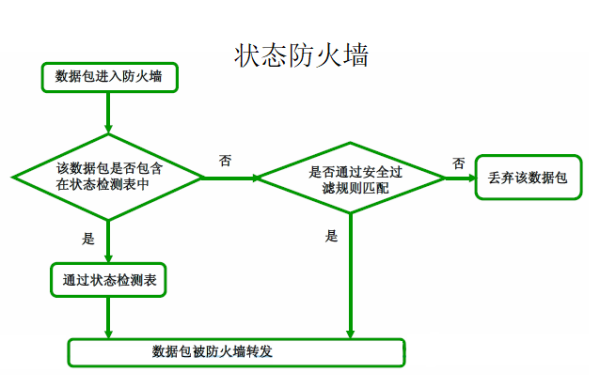 狀態(tài)防火墻能夠持續(xù)追蹤穿過這個(gè)防火墻的各種網(wǎng)絡(luò)連接(例如TCP與UDP連接)的狀態(tài)。這種防火墻被設(shè)計(jì)來區(qū)分不同連接種類下的合法數(shù)據(jù)包。只有匹配主動連接的數(shù)據(jù)包才能夠被允許穿過防火墻,其他的