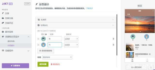 在【風(fēng)格和分頁設(shè)計】里,可以設(shè)置小程序的顏色、風(fēng)格;還可以添加快捷按鈕、輪播圖等版塊,讓小程序顯得更加美觀、高大上、個性化。也可以隨時更改文章布局,給讀者一個更好的瀏覽體驗。