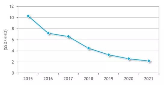據(jù)報道,閃存顆粒價格逐年下降(按照30%~40%的降幅),如下圖所示。