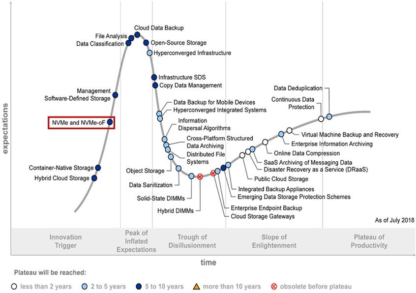 下圖可以看到NVMe和NVMe-oF列入2018年7月Gartner的技術(shù)成熟度曲線圖中。
